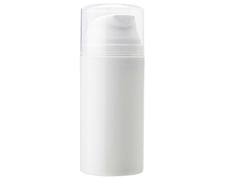 An opaque white, round airless pump bottle with a white airless pump and clear plastic overcap.